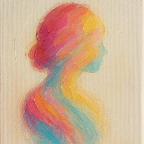 Vanuit een foto van jouw zijprofiel schilder ik de trilling van jouw energie, weergegeven in zachte, vloeiende kleuren en metallic accenten.